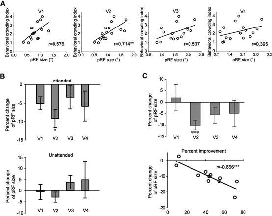 在第一个实验中,研究者使用被试间设计,分别独立地测量了多个视觉皮层区内的目标体素的群感受野大小和每个被试的视觉拥挤的强度,并计算了它们之间的相关。他们发现只有V2 内目标体素的群感受野大小与视觉拥挤强度之间存在显著相关(图2A);在第二个实验中,研究者使用被试内设计,分别测量了两种视觉拥挤强度下,多个视觉区内的目标体素的群感受野大小。他们发现只有V2 内目标体素的群感受野大小在两种视觉拥挤强度条件下有显著差异。并且,群感受野大小的差异依赖于被试对目标刺激的注意(图2B);在第三个实验中,研究者结合知觉学习(perceptual learning)范式,测量了多个视觉区内的目标体素在训练前、后的群感受野大小。他们发现伴随着知觉学习减弱视觉拥挤效应,只有V2 内目标体素的群感受野大小会显著地减小。并且,拥挤效应强度的减弱与体素的群感受野大小的减小之间有显著地正相关(图2C)。这些结果提供了直接的证据表明,V2的群感受野大小在视觉朝向拥挤过程中起着关键性的作用,群感受野越小,拥挤效应越弱。因此,V2的群感受野是视觉朝向拥挤的一个重要瓶颈。
