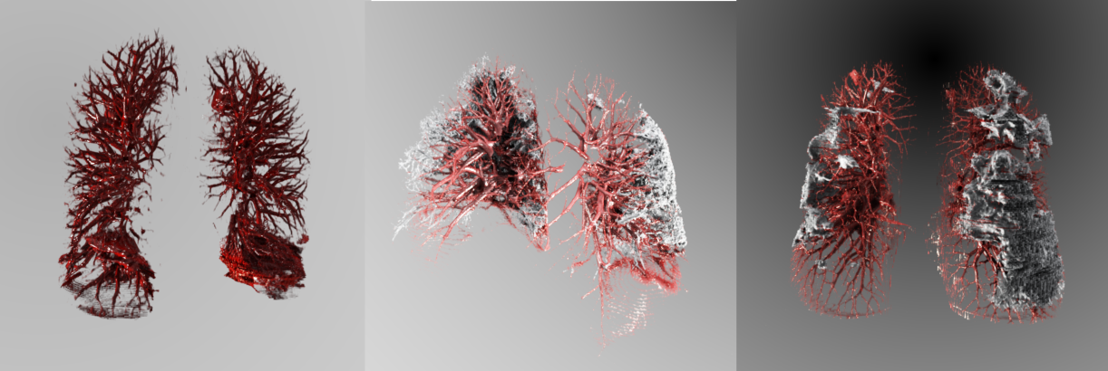 不同CT集可视化效果对比。左1:正常肺部CT集可视化参考;左2:患者A的CT胸片可视化;左3:患者B的CT胸片可视化,明显可见肺部纤维化