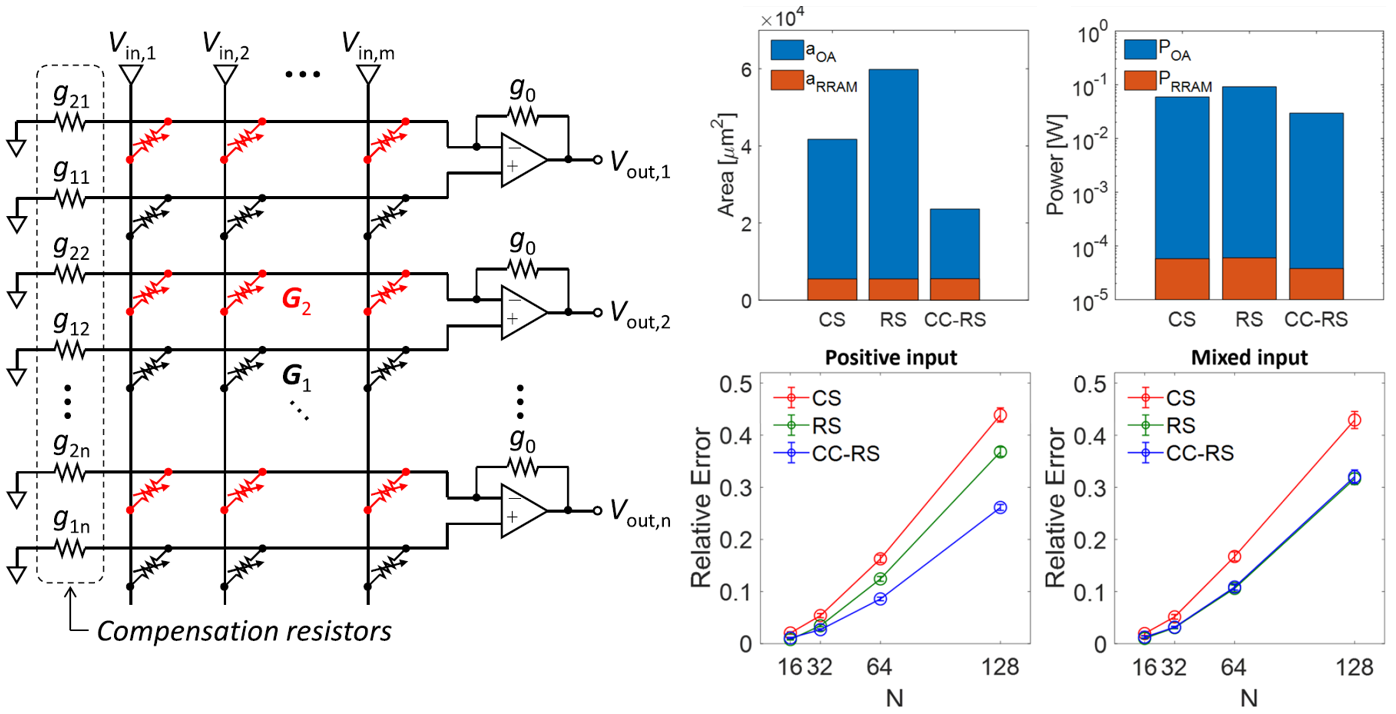 在RRAM模拟矩阵计算电路中,由于RRAM的电导值只能为正,对于含负元素的矩阵运算,通常需要将矩阵分解为两个正元素矩阵相减的形式。传统的电路结构主要分为行拆分模式(row-wise splitting,RS)和列拆分模式(column-wise splitting,CS),各自需要较多的硬件资源,如运放和模拟反相器。为了简化电路的构成与操作,该工作提出了一种在行拆分(RS)基础上,基于电导补偿策略(conductance compensation,CC)实现的MVM电路(图3)。相比于RS和CS电路,CC-RS电路通过在阵列中增加一列补偿电导,使得每一行上只需要一个运放来完成运算,从而显著降低电路所需的面积和功耗。同时在计算精度的测试中,CC-RS电路也表现出更好的性能,当输入向量的极性相同时,CC-RS电路表现出对互连电阻、器件电导随机性更高的容忍度。