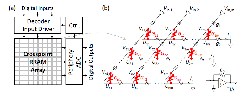 阻变存储器(RRAM)具有突出的模拟电导特性,它常采用的交叉阵列架构能够自然地用电导值表示矩阵元素,再通过利用运算放大器形成局部或全局的反馈回路,实现各种基本的模拟矩阵运算(AMC),如矩阵-向量乘法(MVM)。在实际电路中,器件/电路的非理想因素如互连电阻、源漏电阻、器件电导随机性等会极大地影响计算精度(图1)。MVM电路的快速仿真与性能优化对于大规模系统集成的研究具有重要的基础意义。