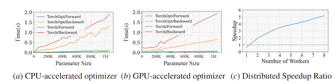 上图中显示TorchOpt的性能,(a)和(b)是不同参数大小下TorchOpt和PyTorch的前向/后向时间(Adam 优化器)比较,(c)是使用 RPC 分布式框架的多 GPU 加速实现与顺序实现的训练加速比。