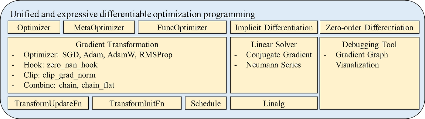 TorchOpt提供了一种统一的编程抽象,可以高效地定义和分析可微优化程序,适用于显式、隐式和零阶梯度。