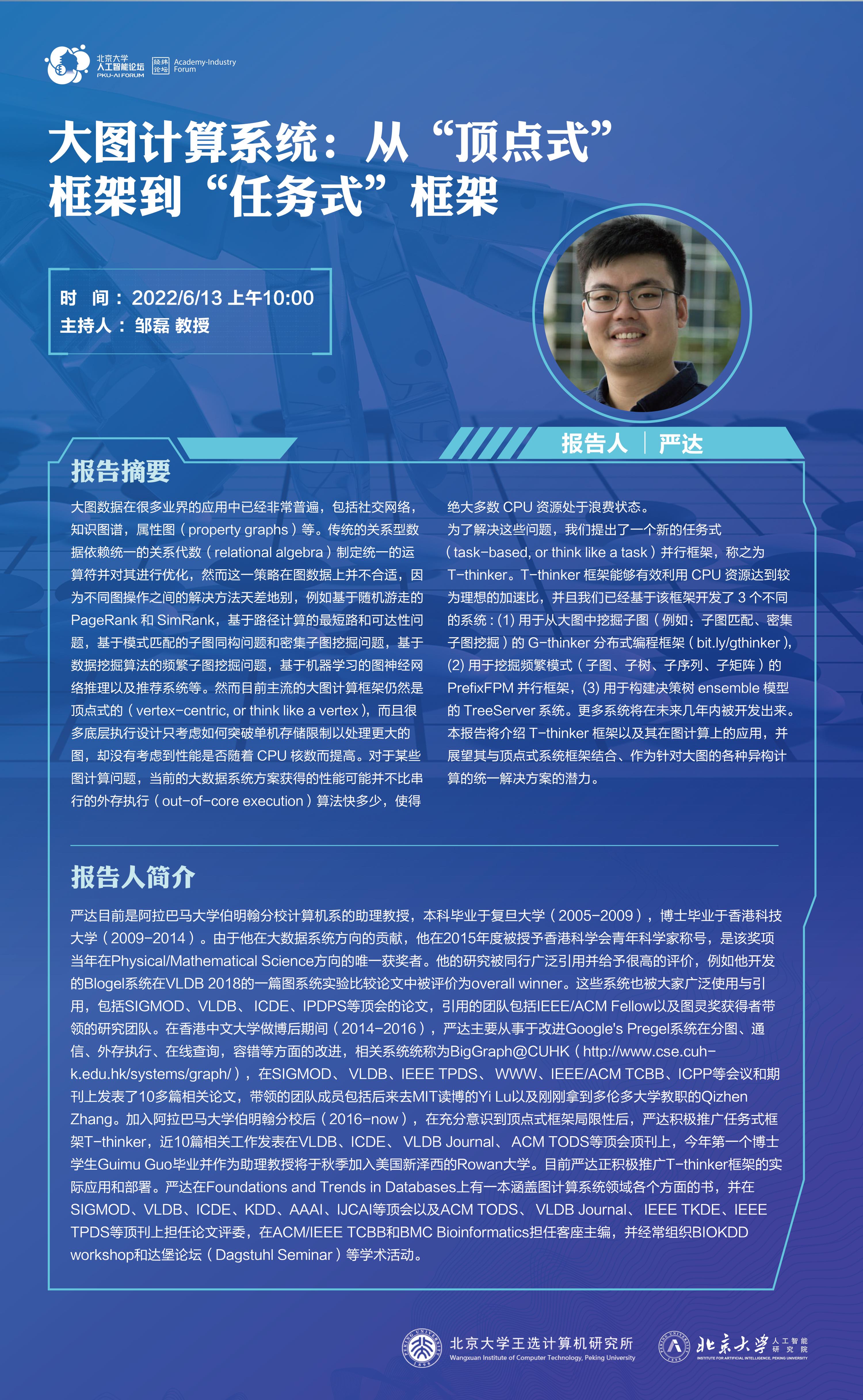 严达目前是阿拉巴马大学伯明翰分校计算机系的助理教授,本科毕业于复旦大学(2005-2009),博士毕业于香港科技大学(2009-2014)。由于他在大数据系统方向的贡献,他在2015年度被授予香港科学会青年科学家称号,是该奖项当年在Physical/Mathematical Science方向的唯一获奖者。他的研究被同行广泛引用并给予很高的评价,例如他开发的Blogel系统在VLDB 2018的一篇图系统实验比较论文中被评价为overall winner。这些系统也被大家广泛使用与引用,包括SIGMOD, VLDB, ICDE, IPDPS等顶会的论文,引用的团队包括IEEE/ACM Fellow以及图灵奖获得者带领的研究团队。在香港中文大学做博后期间(2014-2016),严达主要从事于改进Google's Pregel系统在分图,通信,外存执行,在线查询,容错等方面的改进,相关系统统称为BigGraph@CUHK(http://www.cse.cuhk.edu.hk/systems/graph/),在SIGMOD, VLDB,IEEE TPDS, WWW,IEEE/ACM TCBB,ICPP等会议和期刊上发表了10多篇相关论文,带领的团队成员包括后来去MIT读博的Yi Lu以及刚刚拿到多伦多大学教职的Qizhen Zhang。加入阿拉巴马大学伯明翰分校后(2016-now),在充分意识到顶点式框架局限性后,严达积极推广任务式框架T-thinker,近10篇相关工作发表在VLDB, ICDE, VLDB Journal, ACM TODS等顶会顶刊上,今年第一个博士学生Guimu Guo毕业并作为助理教授将于秋季加入美国新泽西的Rowan大学。目前严达正积极推广T-thinker框架的实际应用和部署。严达在Foundations and Trends in Databases上有一本涵盖图计算系统领域各个方面的书,并在SIGMOD,VLDB,ICDE,KDD,AAAI,IJCAI等顶会以及ACM TODS, VLDB Journal, IEEE TKDE,IEEE TPDS等顶刊上担任论文评委,在ACM/IEEE TCBB和BMC Bioinformatics担任客座主编,并经常组织BIOKDD workshop和达堡论坛(Dagstuhl Seminar)等学术活动。