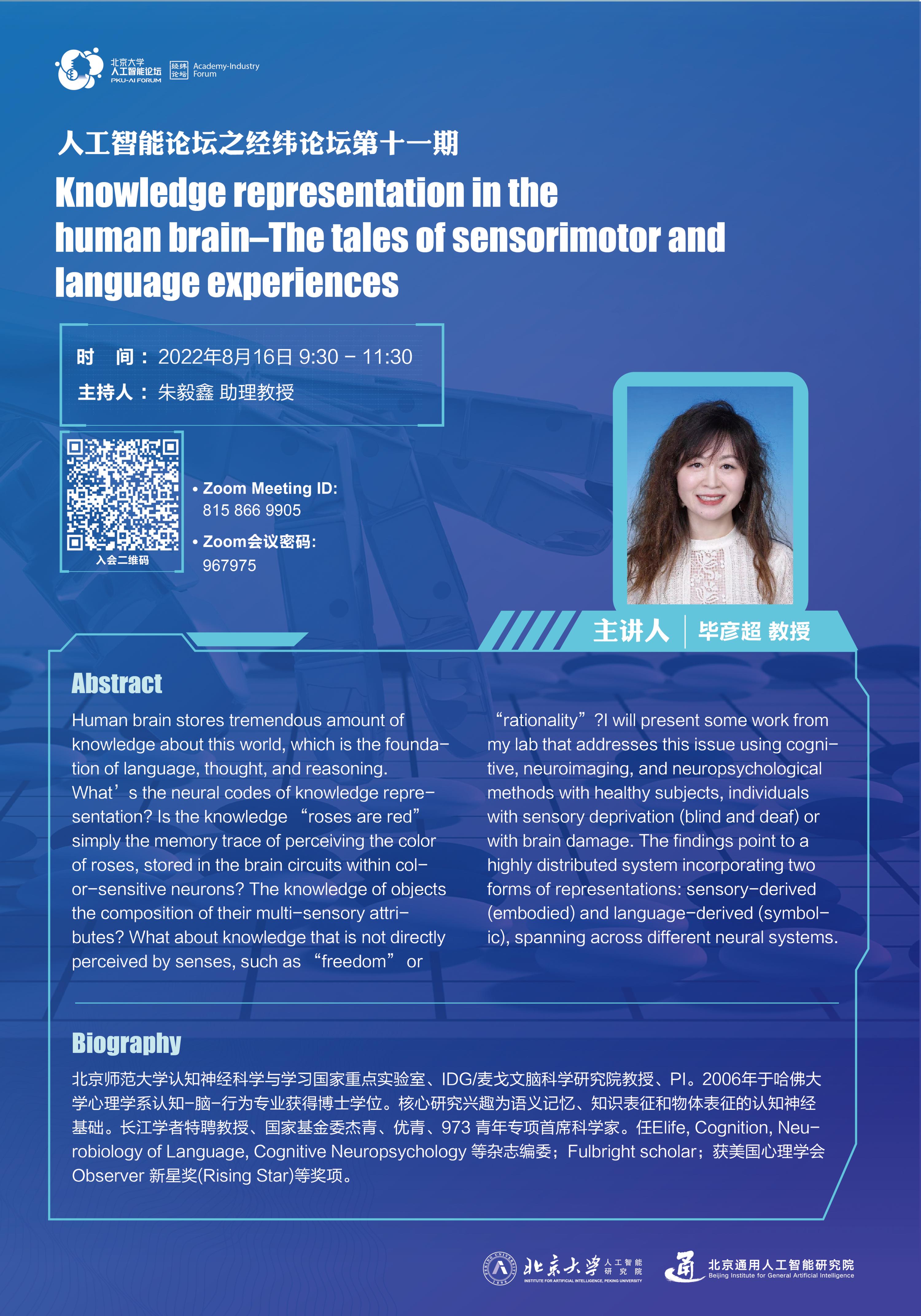 Human brain stores tremendous amount of knowledge about this world, which is the foundation of language, thought, and reasoning. What’s the neural codes of knowledge representation? Is the knowledge “roses are red” simply the memory trace of perceiving the color of roses, stored in the brain circuits within color-sensitive neurons? The knowledge of objects the composition of their multi-sensory attributes? What about knowledge that is not directly perceived by senses, such as “freedom” or “rationality”? I will present some work from my lab that addresses this issue using cognitive, neuroimaging, and neuropsychological methods with healthy subjects, individuals with sensory deprivation (blind and deaf) or with brain damage. The findings point to a highly distributed system incorporating two forms of representations: sensory-derived (embodied) and language-derived (symbolic), spanning across different neural systems.