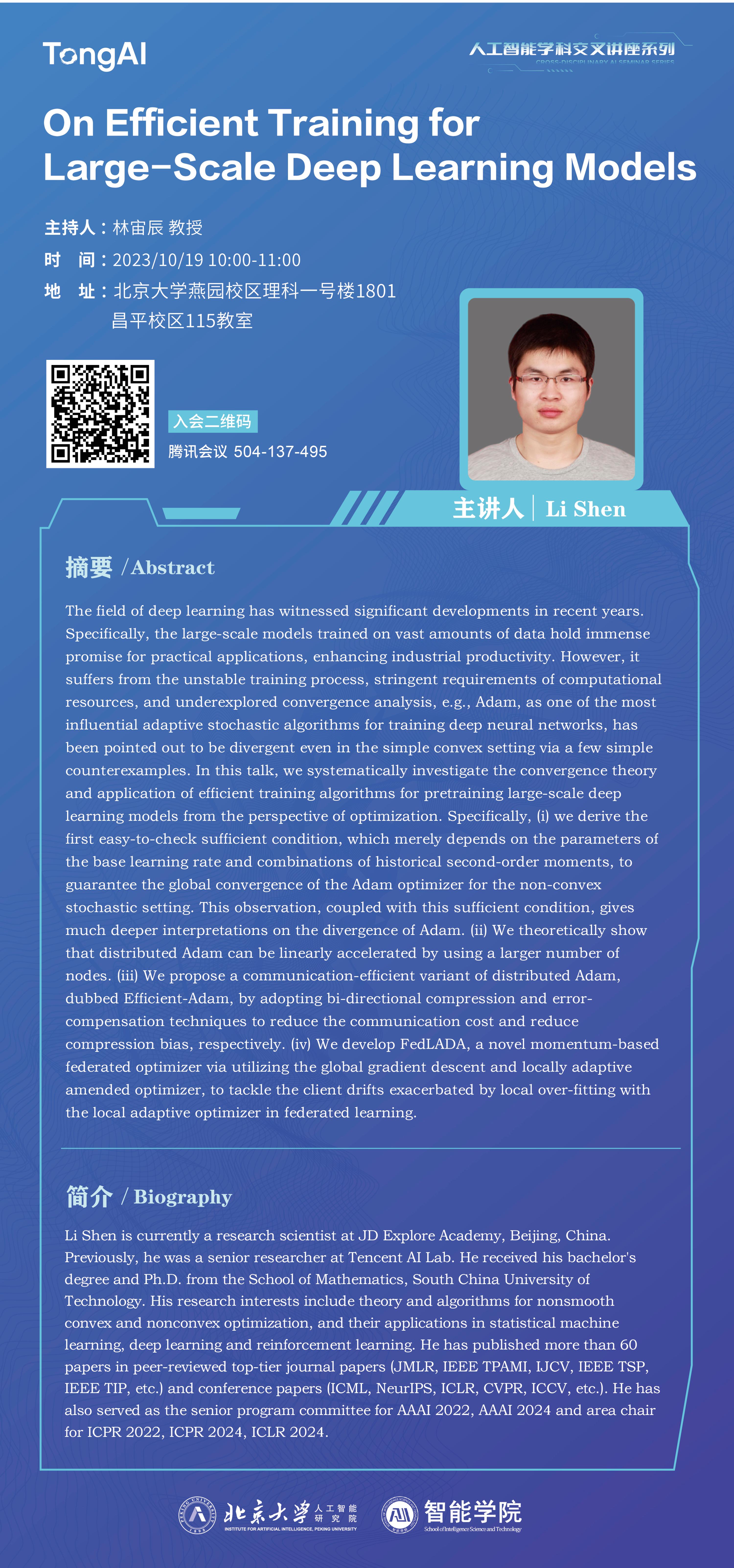 Li Shen is currently a research scientist at JD Explore Academy, Beijing, China. Previously, he was a senior researcher at Tencent AI Lab. He received his bachelor's degree and Ph.D. from the School of Mathematics, South China University of Technology. His research interests include theory and algorithms for nonsmooth convex and nonconvex optimization, and their applications in statistical machine learning, deep learning and reinforcement learning. He has published more than 60 papers in peer-reviewed top-tier journal papers (JMLR, IEEE TPAMI, IJCV, IEEE TSP, IEEE TIP, etc.) and conference papers (ICML, NeurIPS, ICLR, CVPR, ICCV, etc.). He has also served as the senior program committee for AAAI 2022, AAAI 2024 and area chair for ICPR 2022, ICPR 2024, ICLR 2024.