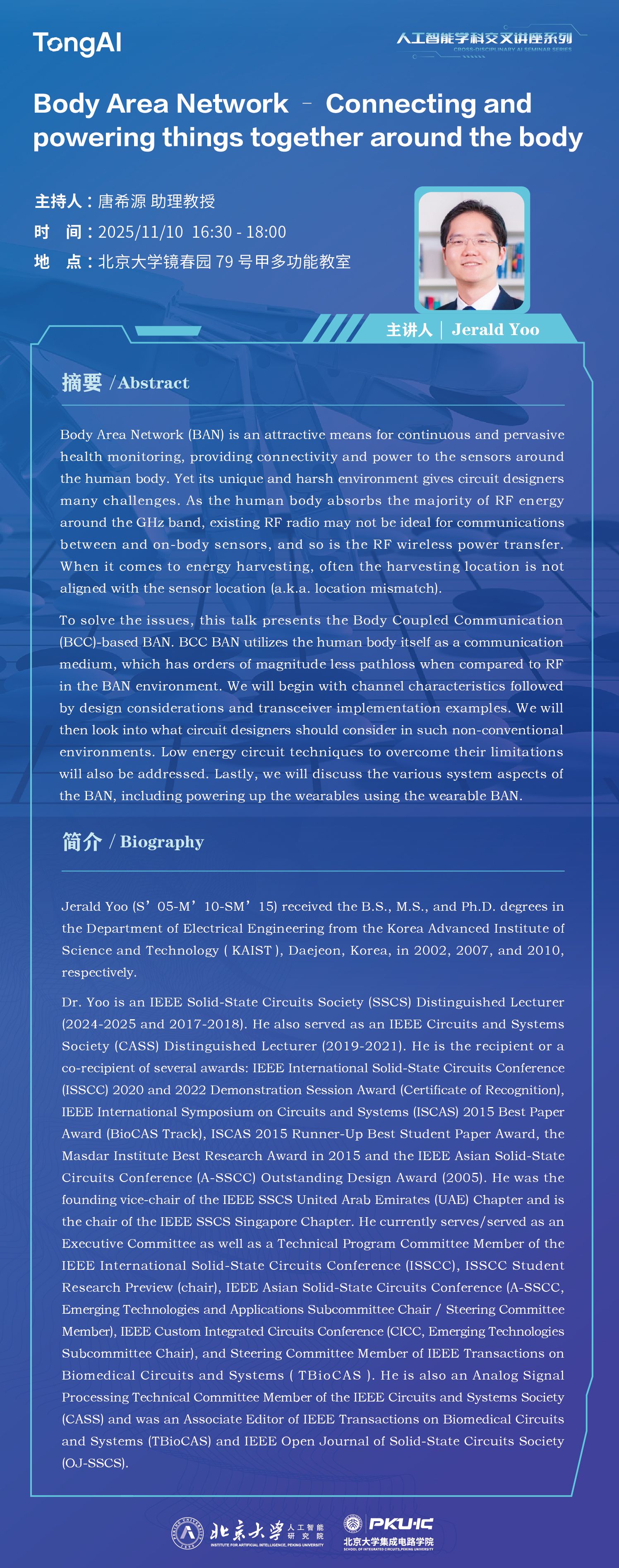 To solve the issues, this talk presents the Body Coupled Communication (BCC)-based BAN. BCC BAN utilizes the human body itself as a communication medium, which has orders of magnitude less pathloss when compared to RF in the BAN environment. We will begin with channel characteristics followed by design considerations and transceiver implementation examples. We will then look into what circuit designers should consider in such non-conventional environments. Low energy circuit techniques to overcome their limitations will also be addressed. Lastly, we will discuss the various system aspects of the BAN, including powering up the wearables using the wearable BAN.
