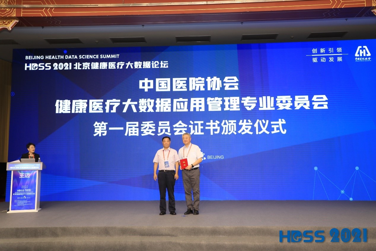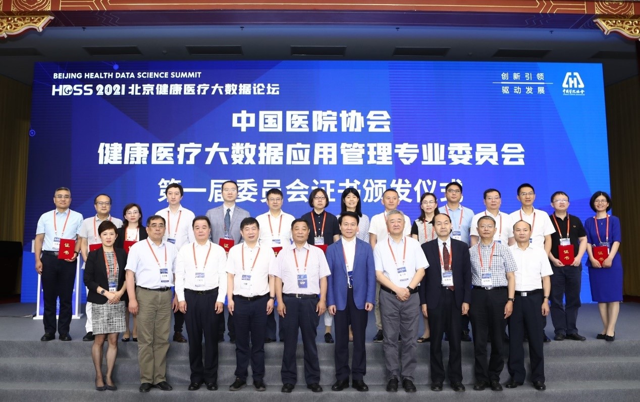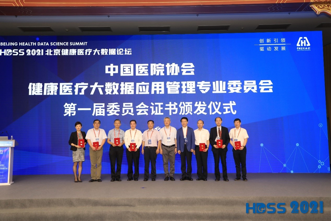 主席演讲环节结束后,举行了中国医院协会健康医疗大数据应用管理专业委员会第一届委员会的证书颁发仪式,为主任委员、副主任委员和常务委员颁发证书。