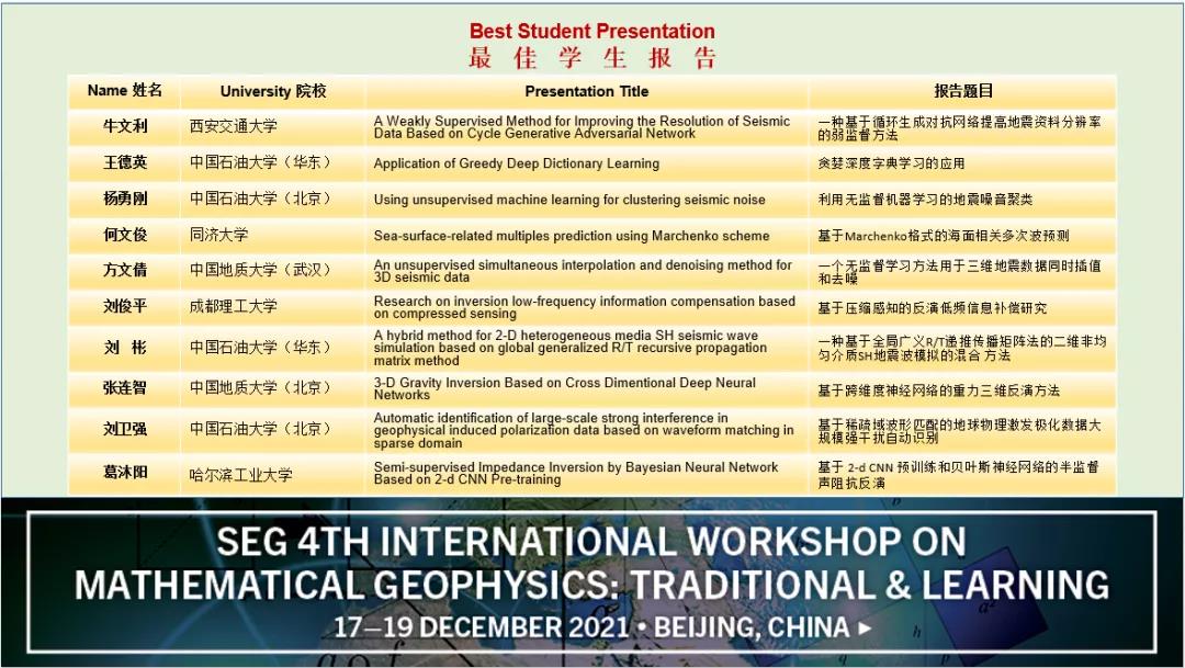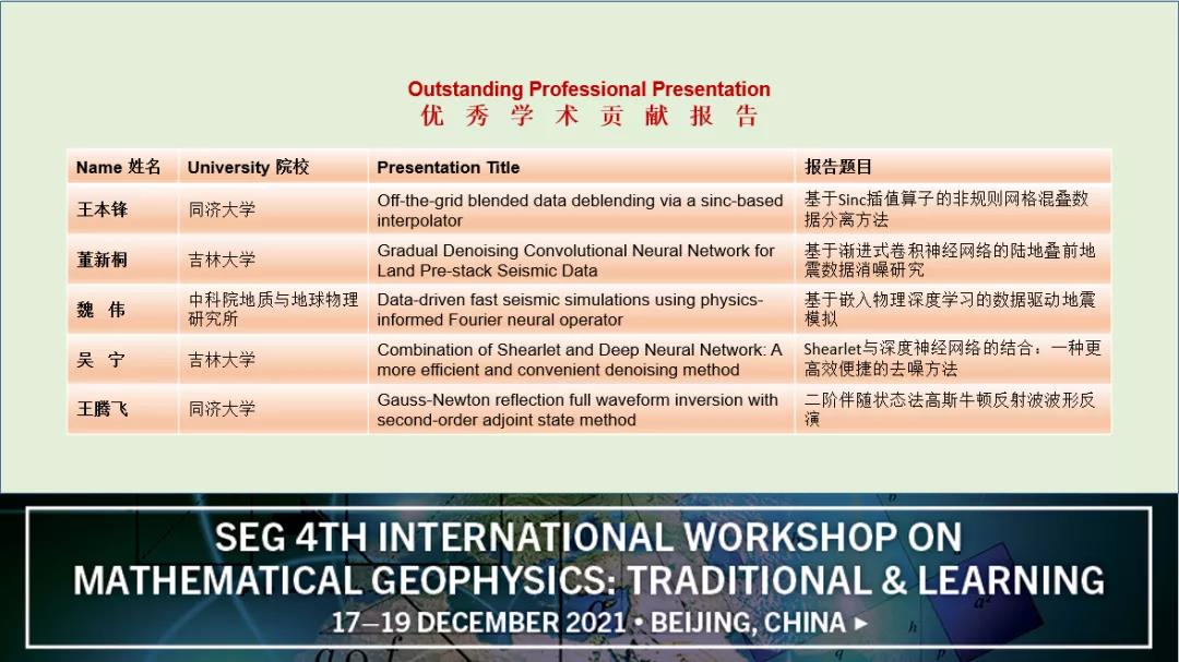 由SEG国际勘探地球物理学家学会主办,北京大学地球与空间科学学院、北京大学人工智能研究院、哈尔滨工业大学数学学院共同协办的“SEG第四届国际数学地球物理会议:传统和学习”于2021年12月17-19日在线顺利召开。
