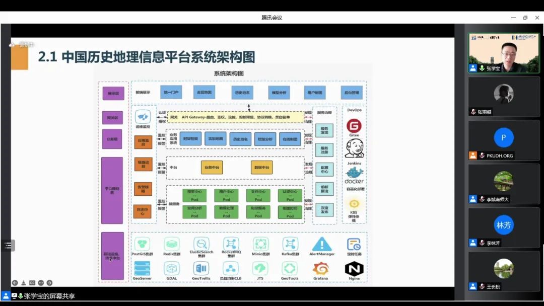 张学宝总经理的分享主题是“中国历史地理信息平台开放构建的关键技术”,重点围绕HGIS对数字人文建设的意义和中国历史地理信息平台关键技术两个问题展开:HGIS作为各类数字人文建设的时空基础设施,具备时空数据的存储、管理和服务能力,以及可视化与空间分析能力,对于数字人文建设具有丰富的意义;同时他展示了中国历史地理信息平台的系统架构图、微服务架构图和关键技术栈。张学宝总经理还分享了他在历史地理信息系统建设方面的一些经验和感悟,结合公司在历史地理信息系统建设方面的一些实际案例,不同的案例体现出历史地理信息系统的不同应用价值。张学宝总经理对系统的构建思路是,“实现开放共享、服务在线、交叉研究、协同交互”,公司的愿景是“以数字重建历史,用地图讲好中国故事”。