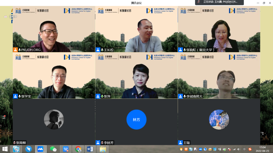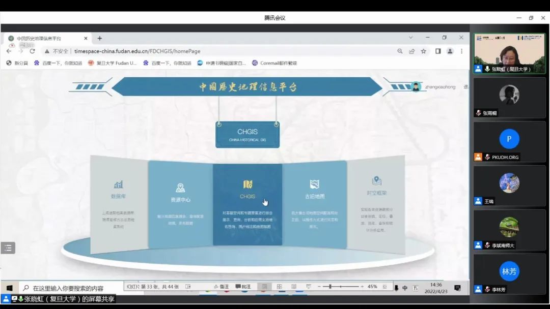 2022年4月23日下午,由北京大学数字人文研究中心、北京大学人工智能研究院主办的“古籍智能信息处理”系列专题研讨会第三讲在腾讯会议如期举行。本期主题为“历史地理信息系统的建设与发展”。研讨会邀请多家古籍数字平台的创始人针对历史地理信息系统平台建设、古旧地图数字化应用、重点区域历史地理信息沿革介绍、历史地理信息平台关键技术等问题进行了深入研讨。本期研讨会由复旦大学中国历史地理研究所所长张晓虹教授担任主讲人,首都师范大学历史学院教授张萍、北京大学城市与环境学院历史地理研究所研究员王长松、西安云图信息技术有限公司总经理张学宝担任与谈人。本次研讨会通过腾讯会议和Bilibili网站同步直播,吸引了来自国内外高校及有关单位的近八百位观众在线观看。