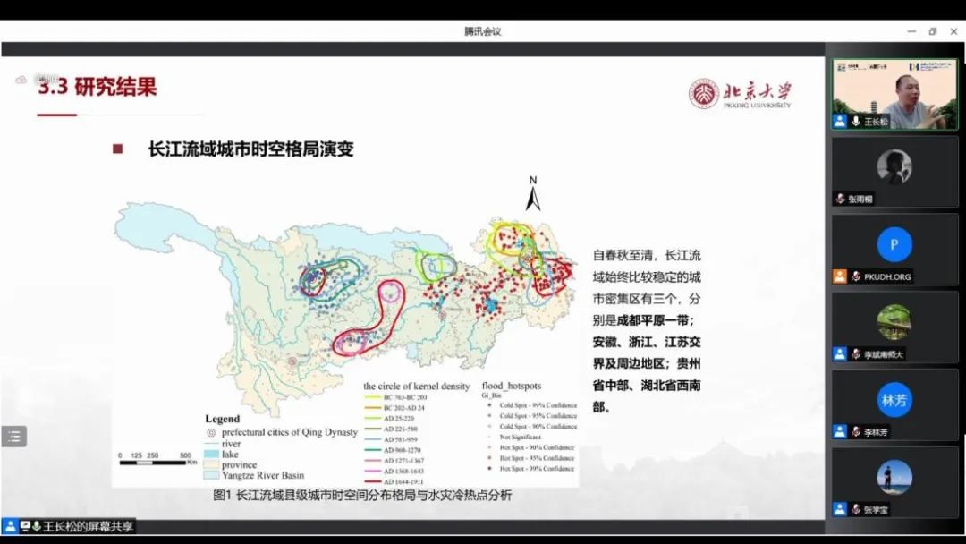 王长松研究员的报告题目为《基于CHGIS的流域空间历史地理研究》,首先介绍了CHGIS平台,通过对CHGIS数据的清洗与分析,研究了历史时期黄河流域城市空间格局演变与影响因素、历史时期长江流域城市与水灾的时空格局演变、黄河中下游“八景”空间格局与文化意义等若干学术问题。王长松教授建议,对于历史数据进行级别划分和简化,以突出研究重点。王长松教授的报告是对前面几位专家关于平台应用的一个生动实例。
