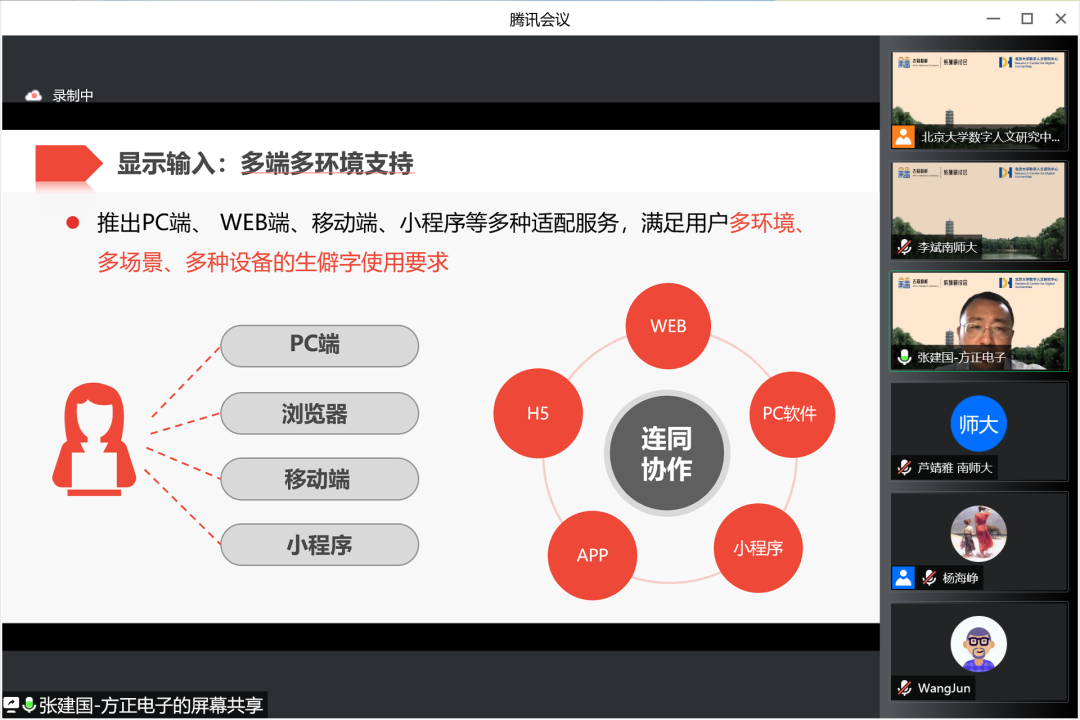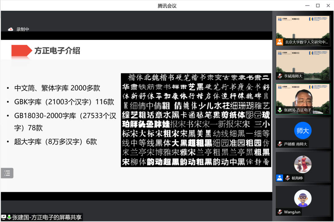 杨海峥老师首先介绍了本次研讨会的主题,说明了古代汉字的字形复杂和数量庞大的特点,强调了古籍字库、字符集整理规范的重要性和基础作用。杨海峥老师介绍了参与本次研讨会报告的各位老师,随后五位专家分享了他们的主要工作和研究成果。