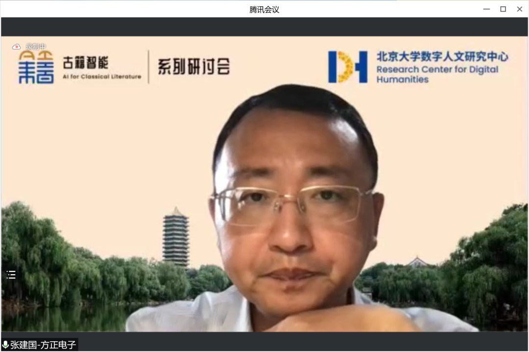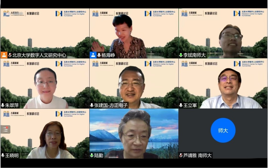 2022年7月16日下午两点,“古籍智能信息处理”系列专题研讨会第六讲在腾讯会议举行。此次研讨会由北京大学数字人文研究中心、中国古籍保护协会古籍智能开发与利用专委会主办,北京大学中国古文献研究中心、南京师范大学文学院联合主办,北京大学-字节跳动数字人文开放实验室、北京大学人工智能研究院承办,会议由北京大学中国语言文学系杨海峥教授、古联(北京)数字传媒科技有限公司朱翠萍副总经理主持。