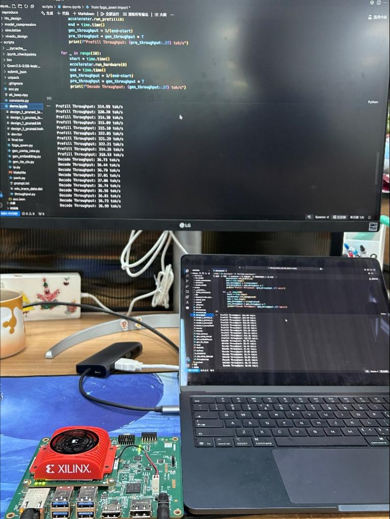 本届大模型硬件设计赛道要求参赛团队基于FPGA平台设计端侧大模型推理系统,需在资源受限条件下实现低延迟、高能效的硬件加速方案。团队提出“全算子融合架构”,通过优化模型计算图、设计算子调度策略,提升带宽利用率至理论值,在KV260平台上将大模型推理吞吐量提升至业界领先水平,部署大模型为Qwen2.5-0.5B-Instruct,prefill速度达到350 token/s,decode速度达到35 token/s。该方案在边缘端计算场景下表现出优异的能效与资源效率,在关键解码速度指标较第二名实现了4倍提升。