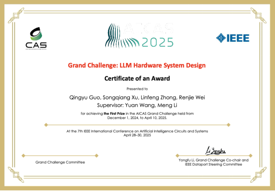 在2025年人工智能电路与系统(AICAS)会议Grand Challenge赛事中,人工智能研究院李萌研究员与集成电路学院王源教授联合指导的学生队伍郭晴宇、钟林峰、许颂强、魏仁杰凭借创新性技术方案,从全球数十只支报名参赛队伍中脱颖而出,摘得第二赛道(大模型硬件系统设计)冠军,其成果为解决边缘计算场景中大模型高效部署提供了新的思路。
