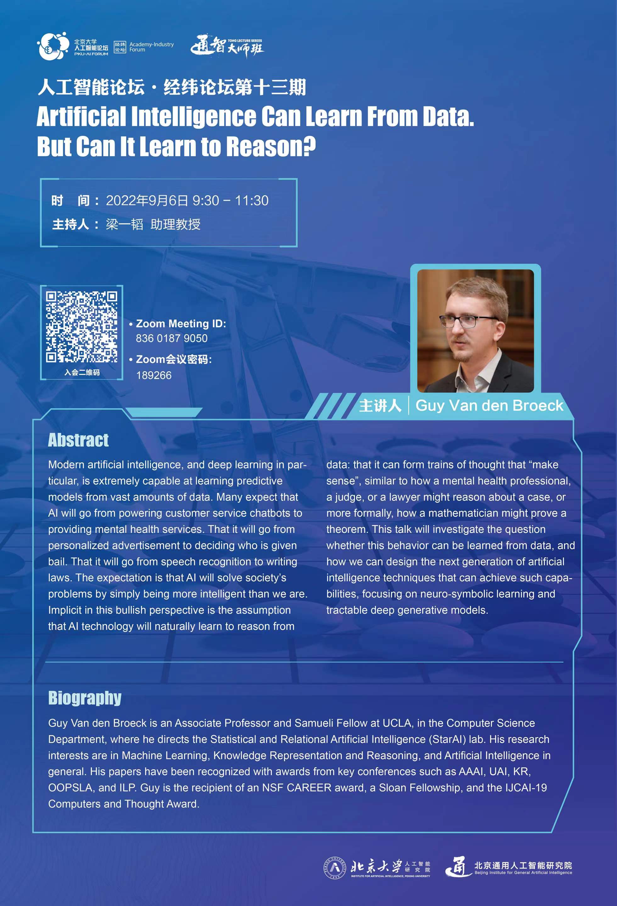 Modern artificial intelligence, and deep learning in particular, is extremely capable at learning predictive models from vast amounts of data. Many expect that AI will go from powering customer service chatbots to providing mental health services. That it will go from personalized advertisement to deciding who is given bail. That it will go from speech recognition to writing laws. The expectation is that AI will solve society’s problems by simply being more intelligent than we are. Implicit in this bullish perspective is the assumption that AI technology will naturally learn to reason from data: that it can form trains of thought that “make sense”, similar to how a mental health professional, a judge, or a lawyer might reason about a case, or more formally, how a mathematician might prove a theorem. This talk will investigate the question whether this behavior can be learned from data, and how we can design the next generation of artificial intelligence techniques that can achieve such capabilities, focusing on neuro-symbolic learning and tractable deep generative models.