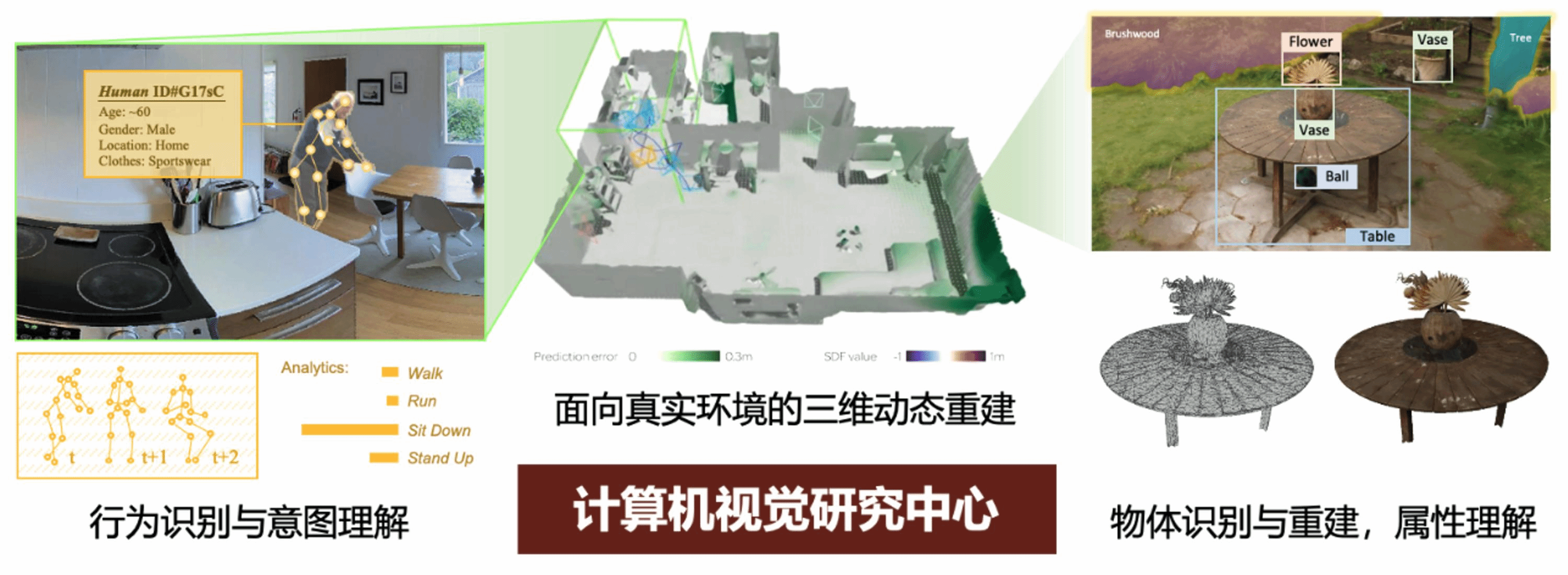 计算机视觉研究中心将致力于研究“面向真实环境的物体识别、场景理解与行为分析”,充分利用先进的传感、成像技术,为智能机器提供鲁棒高效的视觉感知理论与方法;针对结构复杂与动态变化的真实环境与大规模场景,开发多尺度的场景动态三维重建技术,为实时的人·机·环境交互提供技术基础;研究物体目标、场景、事件的识别、理解与解译方法;基于在线学习等途径提高视觉系统的环境自适应能力。