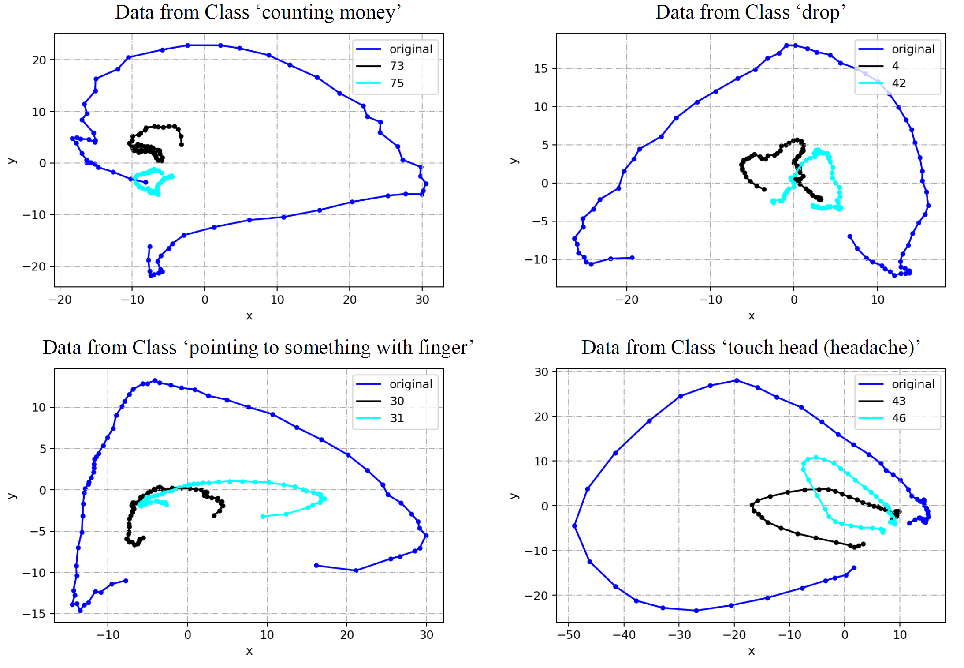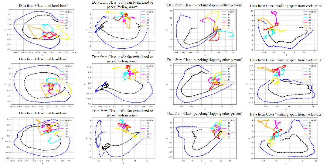 To verify the effectiveness of Koopman pooling, this paper conducted experiments in two settings, including full supervision and one-shot, on three skeleton action recognition benchmark datasets: NTU RGB+D, NTU RGB+D 120, and NW-UCLA. The experimental results show that after adding the Koopman pooling module, the performance of the baseline model CTR-GCN has been significantly improved on all datasets, especially in the one-shot learning setting. The proposed model's accuracy has increased by 2.5% and 6.6% on the NTU120 and NW-UCLA datasets, respectively, compared to previous works, demonstrating significant improvements. Figure 4 shows the visualization results of the Koopman pooling model after eigenvalue regularization, where PCA is used to embed the feature trajectories in the linear space into a 2D plane for visualization. It can be seen that after eigenvalue regularization, the decay problem of the system has been greatly alleviated, and the model can learn specific evolution patterns for different categories, thus achieving accurate classification.