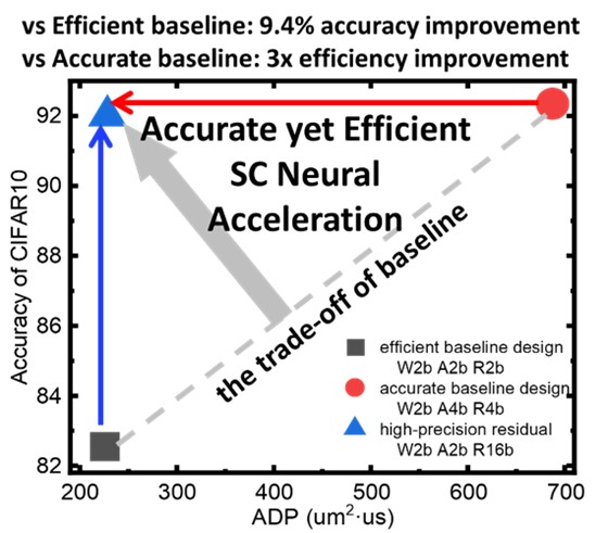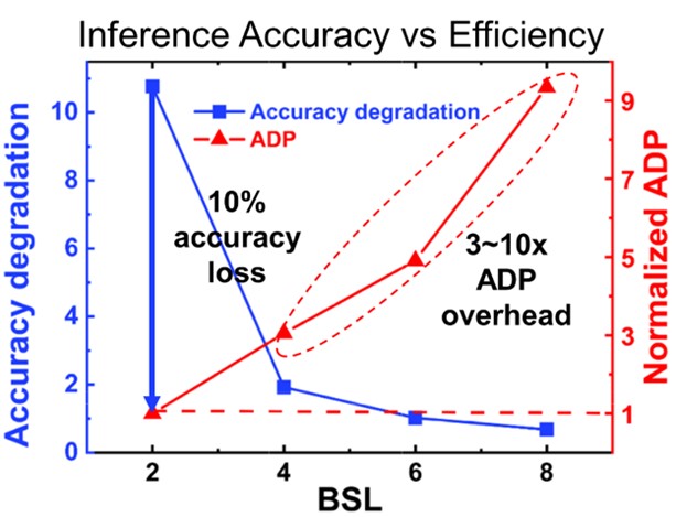 As shown in Figure 1, low-precision SC circuits using short bit streams (e.g., 2 bits) are highly efficient but result in a 10% decrease in accuracy. On the other hand, longer bit streams can improve precision but come with 3 to 10 times higher hardware overhead.