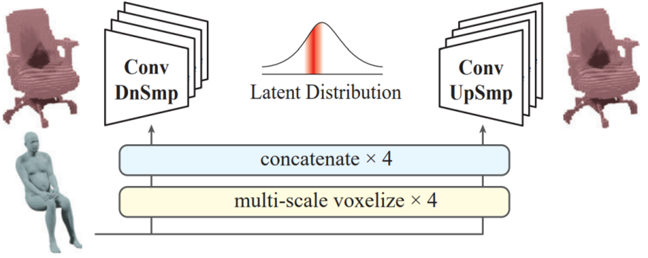 Modeling fine-grained relationships has important value for understanding human-object interactions. This paper proposes an interaction prior model based on cVAE, which learns the 3D spatial distribution of objects given human poses from the large-scale interaction data in CHAIRS. The interaction prior model takes voxelized human bodies as input, and outputs the joint probability distribution of point occupancies in the surrounding space. This modeling approach can infer the most likely object shape given estimated human poses, thus providing necessary guidance for estimating object poses.