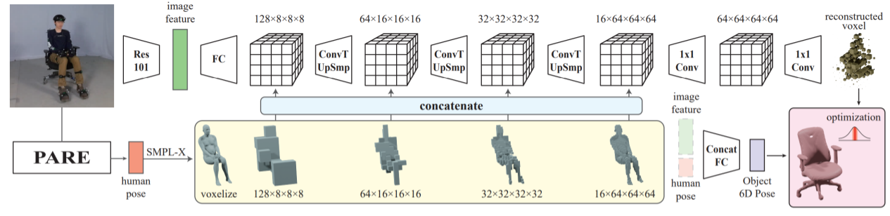 The human body is represented using SMPL-X parameters. If the object model is given, each part of the object is represented using a 6D pose. Without a given model, the object is directly reconstructed in 3D. The object reconstruction model takes the image and estimated human pose as input. It first extracts image features and human voxels at different scales, feeds image features into a 3D deconvolutional network, and concatenates 3D features from each layer with the human voxels. Finally it produces a probability distribution of points occupied by the object in space.