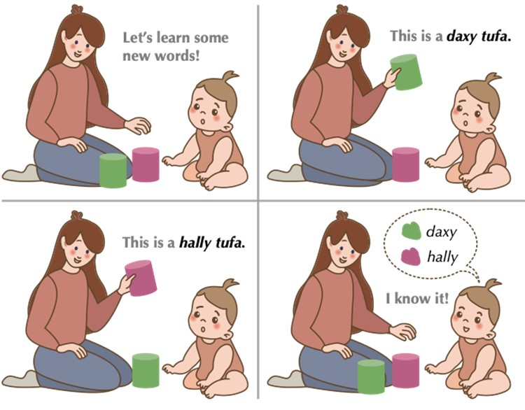Fig 1: Children can acquire a novel word after only few exposures using cross-situational information, even with referential uncertainty. In this example, a child induces that daxy refers to the color green and hally magenta, all from the experience of a daxy tufa (green cylinder) and a hally tufa (magenta cylinder) without explicit guidance.
