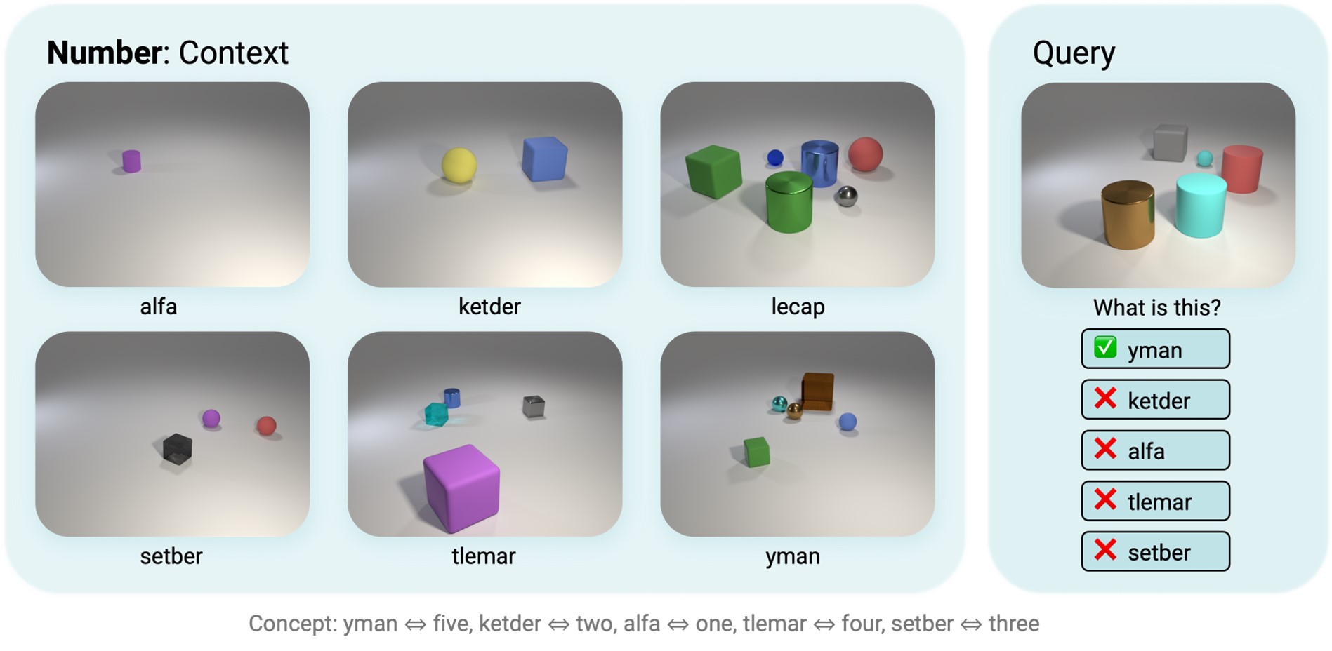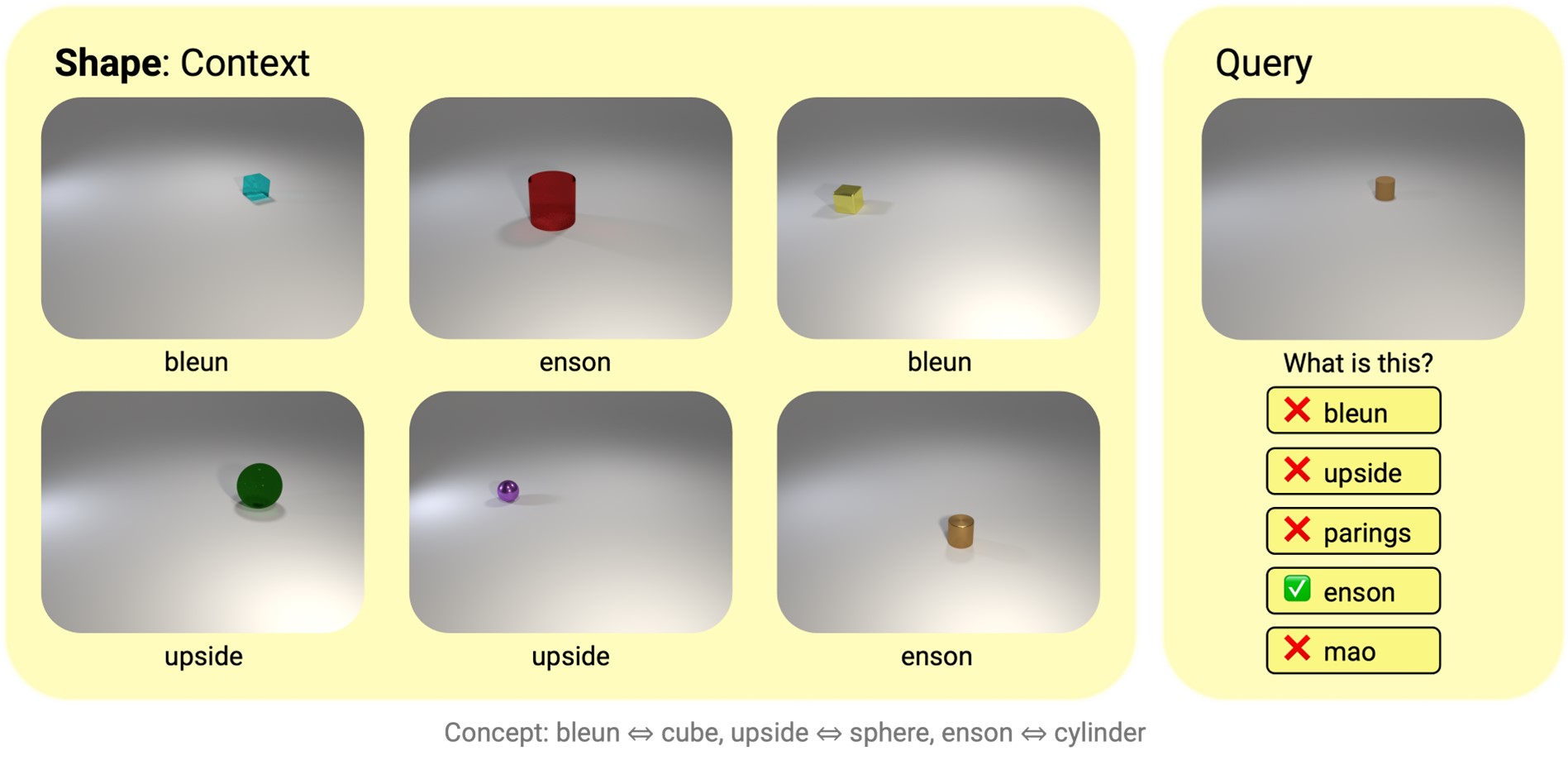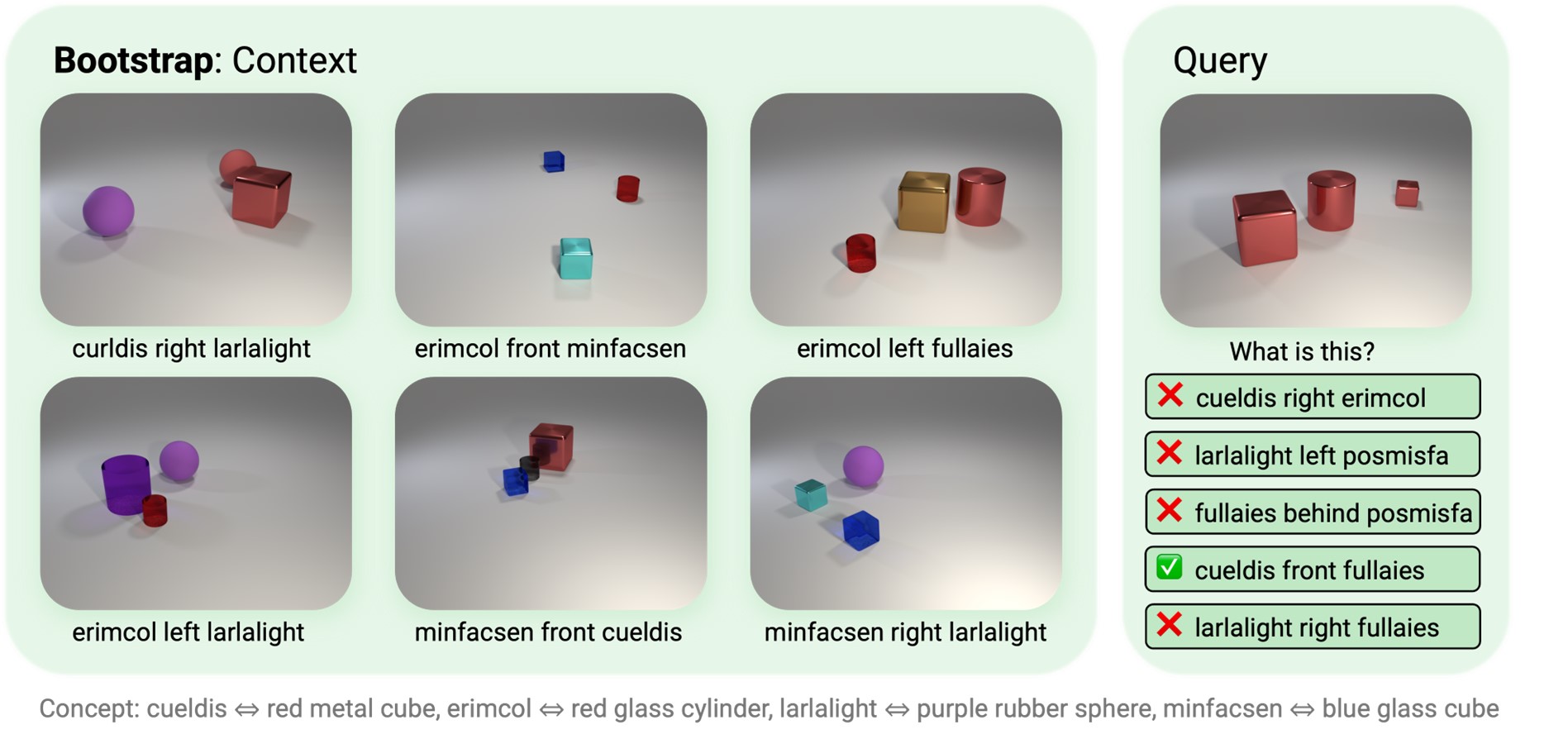 Figs 3-6: Each episode consists of six context images and corresponding utterances. Agents need to choose the correct utterance matching the query image out of the given five options based on cross-situational reasoning from the six context panels. Ground-truth word-to-concept mappings are listed below examples.