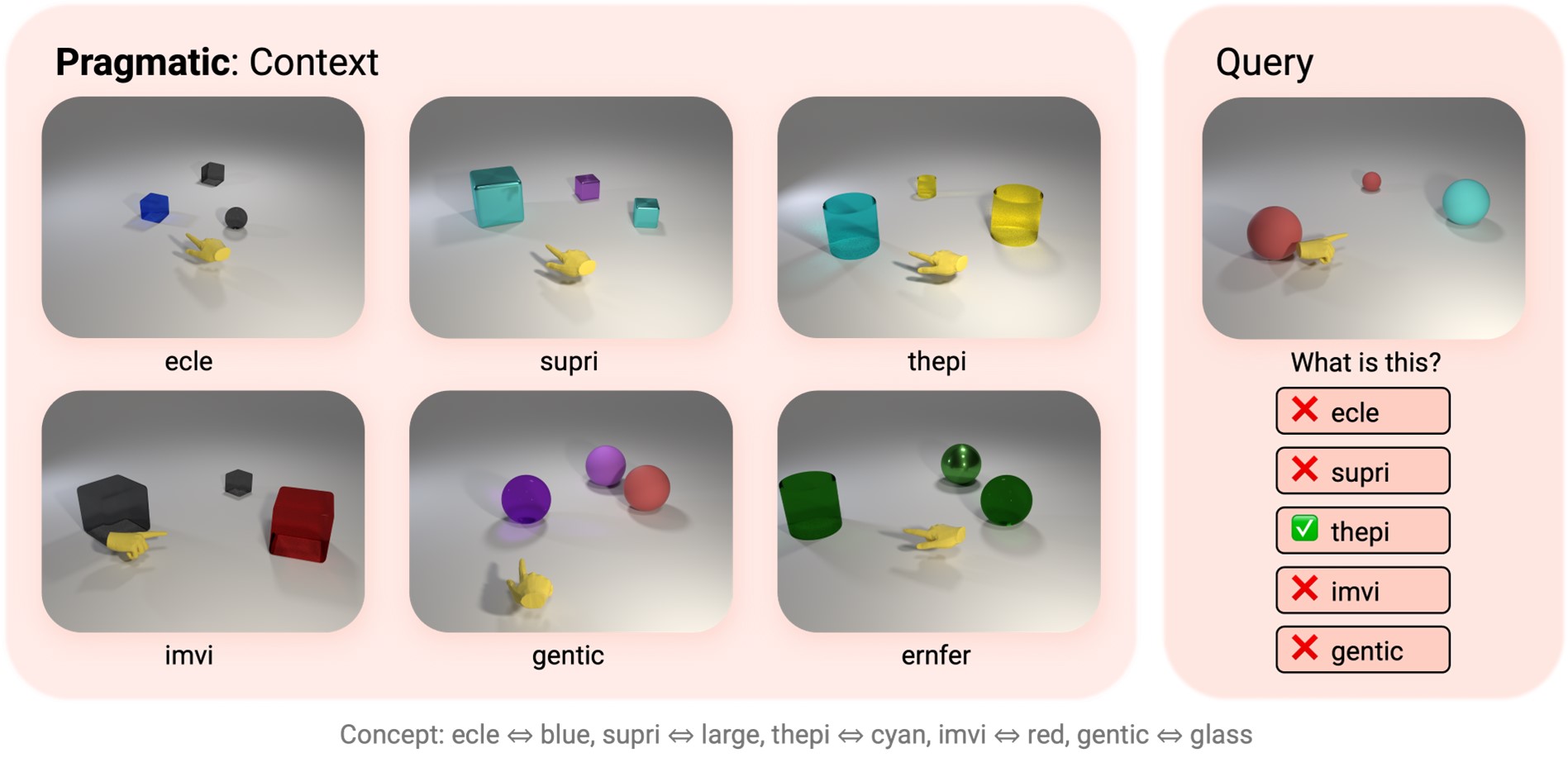 We understand meanings of words with pragmatics, a social account of word learning with the help of other speakers. The fundamental premise is to leverage informative descriptions of the referent (Frank & Goodman, 2014; Horowitz & Frank, 2016; Stacy et al., 2022). For example, if we have a blue cube, a blue ball, and a green cube in a line, a speaker would use the word “ball” to refer to the object in the middle, which is the most informative word to tell them apart (Frank & Goodman, 2012).