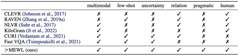 Fig 2: Comparison of MEWL with prior work. We compare MEWL with related benchmarks in six dimensions including multimodality, few-shot, referential uncertainty, relational reasoning, pragmatic reasoning, and human baseline.