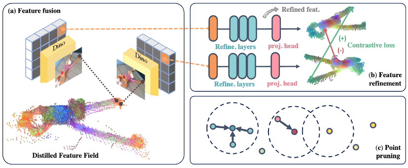 As shown in Figure 4(a), the researchers adopted a 3D feature distillation approach to construct a 3D feature field. Unlike previous methods that directly reconstruct a continuous implicit feature field using NeRF representations, we apply DINO to RGB images and refine discrete 3D points, propagating them into the surrounding space. By leveraging the correspondence between pixels and points, we directly project these features onto each point cloud, generating features for each point.