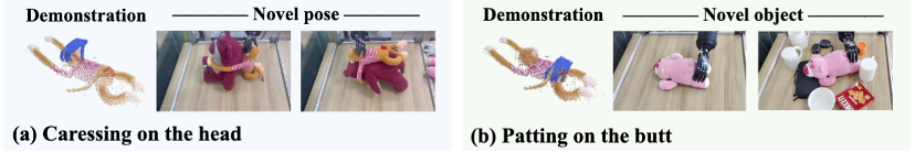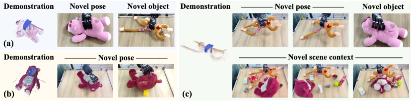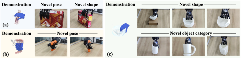 Beyond grasping, the proposed method extends to various manipulation tasks, demonstrating robust generalization to new object poses, deformations, geometries, and categories in real-world scenarios.