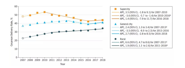 剖宫产作为医学技术手段,在处理高危妊娠、解决难产方面发挥重要作用。但是,超过医学需求的过度应用不仅浪费医疗资源,可能还影响母婴健康。2017年刘建蒙团队在JAMA发表学术论文,阐释了中国剖宫产率的变化趋势及地域分布特征,指出我国面临剖宫产率过高与过低并存的双重挑战。新发文章延续这一主题做了拓展研究。