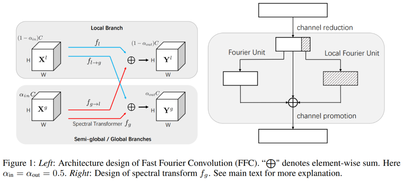 上图展示了参考文献[1]所提出的快速傅里叶卷积(Fast Fourier Convolution,FFC)。该工作是对前期工作[2][3]的扩展研究。同现有的非局部神经网络相比,FFC具有多种优势:1)同普通卷积算子相比,在复杂度几乎相等的情况下,在多种任务上一致性地表现出显著性能提升。同现有的非局部神经网络技术相比,FFC能够在大多数神经网络中无缝替换现有的普通卷积算子(而非现有技术所采用的稀疏插入方式),使得深度模型的每一处都获得非局部神经感受野;2)能够在同一卷积单元里通过可学习的参数来实现三种尺度信息(分别是全局尺度、局部尺度和半全局尺度)的融合。实验证明,这种跨尺度的信息融合对于上下文敏感(context-sensitive)的计算任务至关重要。