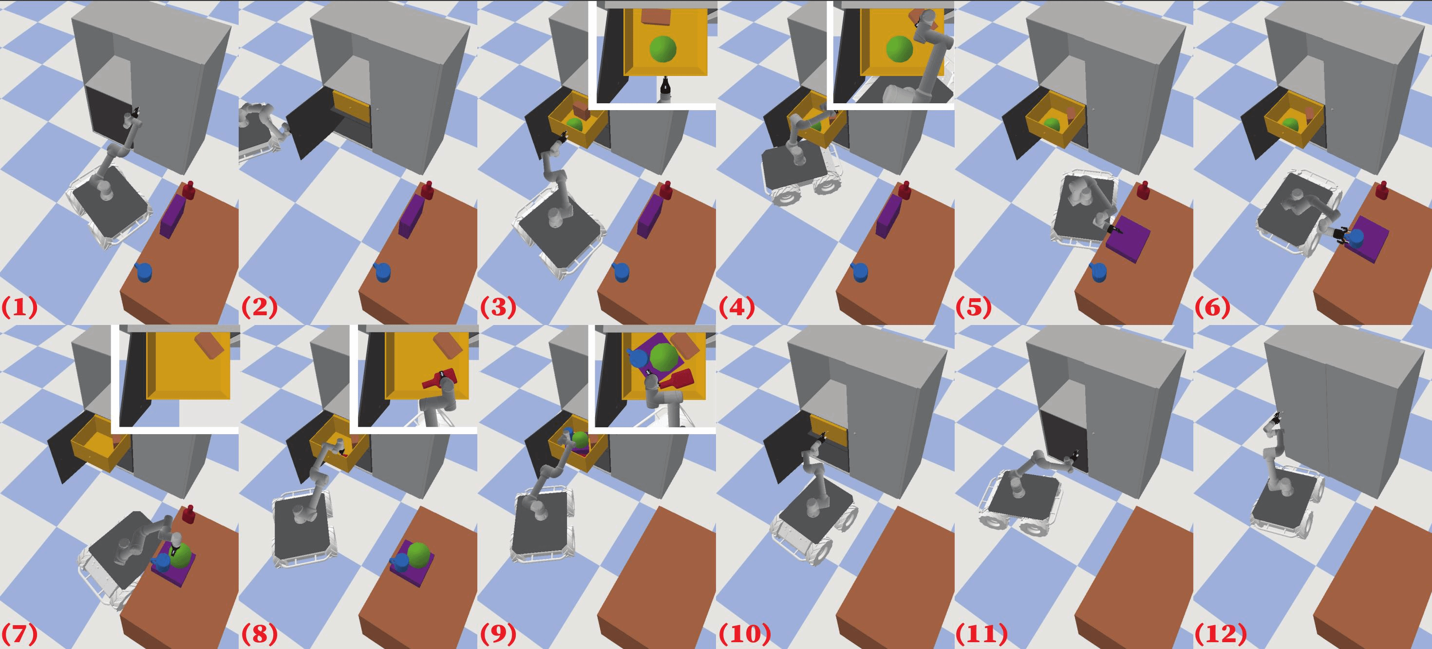 下图展示了任务规划的结果,我们可以发现几点有趣的现象:原本抽屉里的棕色盒子最先被移到一旁,给后续动作提供空间;紫色的盒子被放倒,作为一个托盘将绿色和蓝色的物体一起放入抽屉,简化了动作,提高了效率;红色的瓶子因为超高被倒着放进抽屉。正是利用了场景图丰富的信息,我们的规划方法得以更好地结合物理规律和常识来规划更有效的行动计划。
