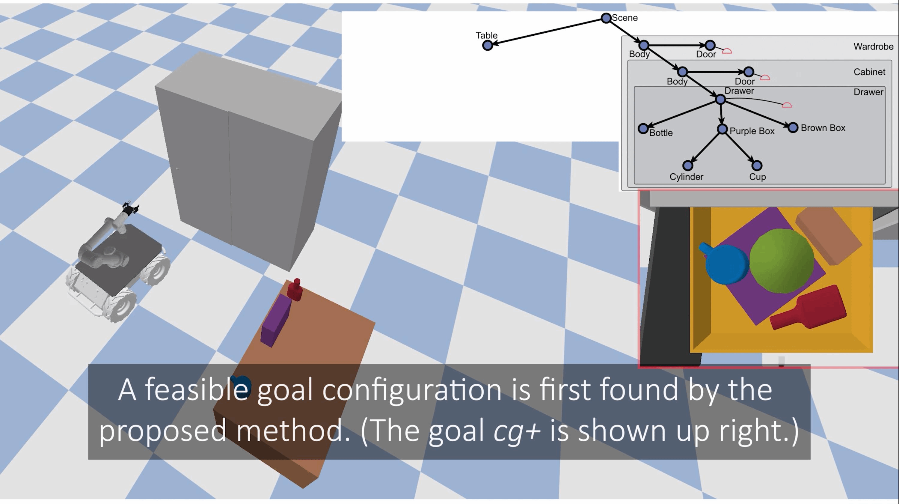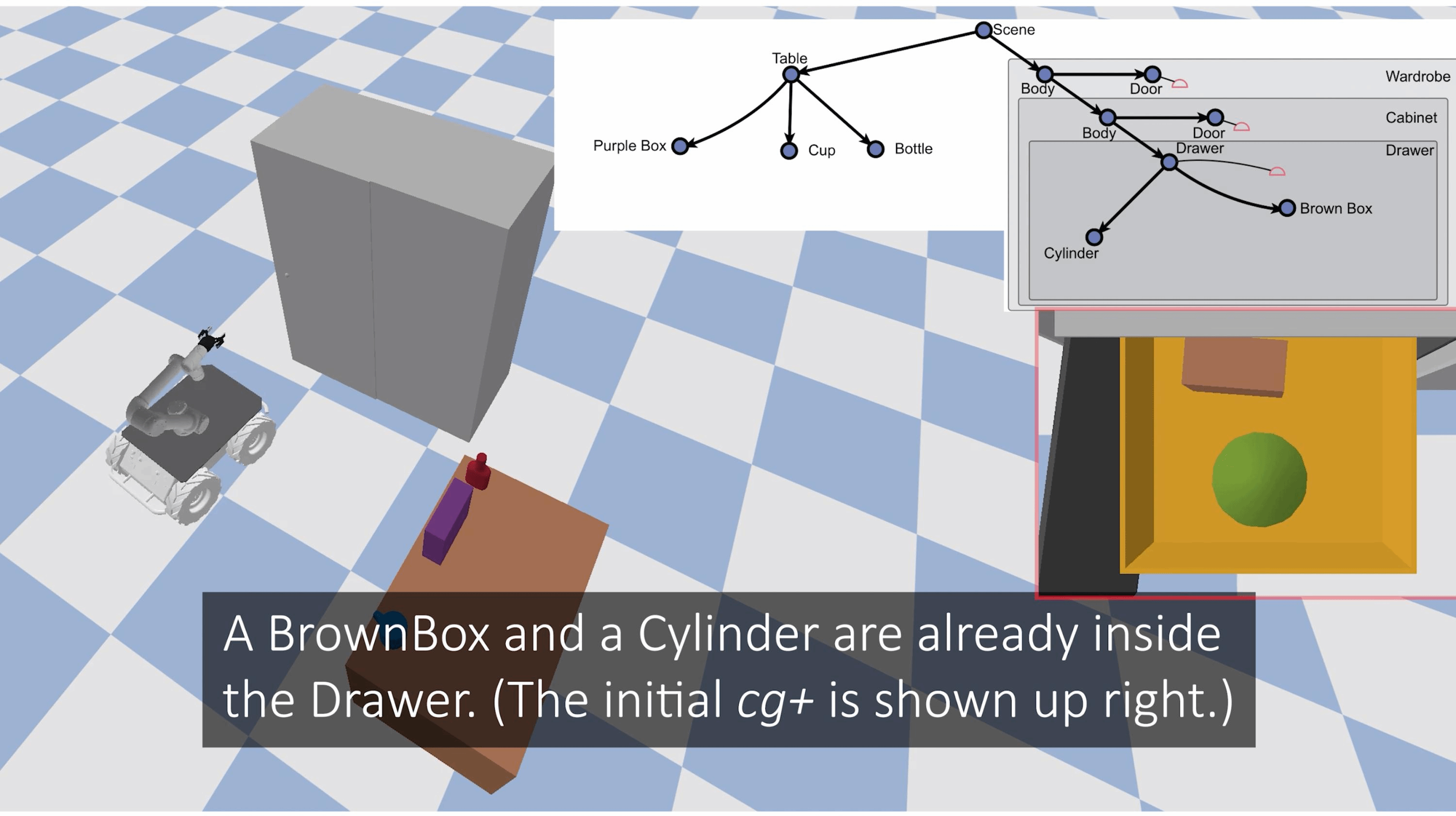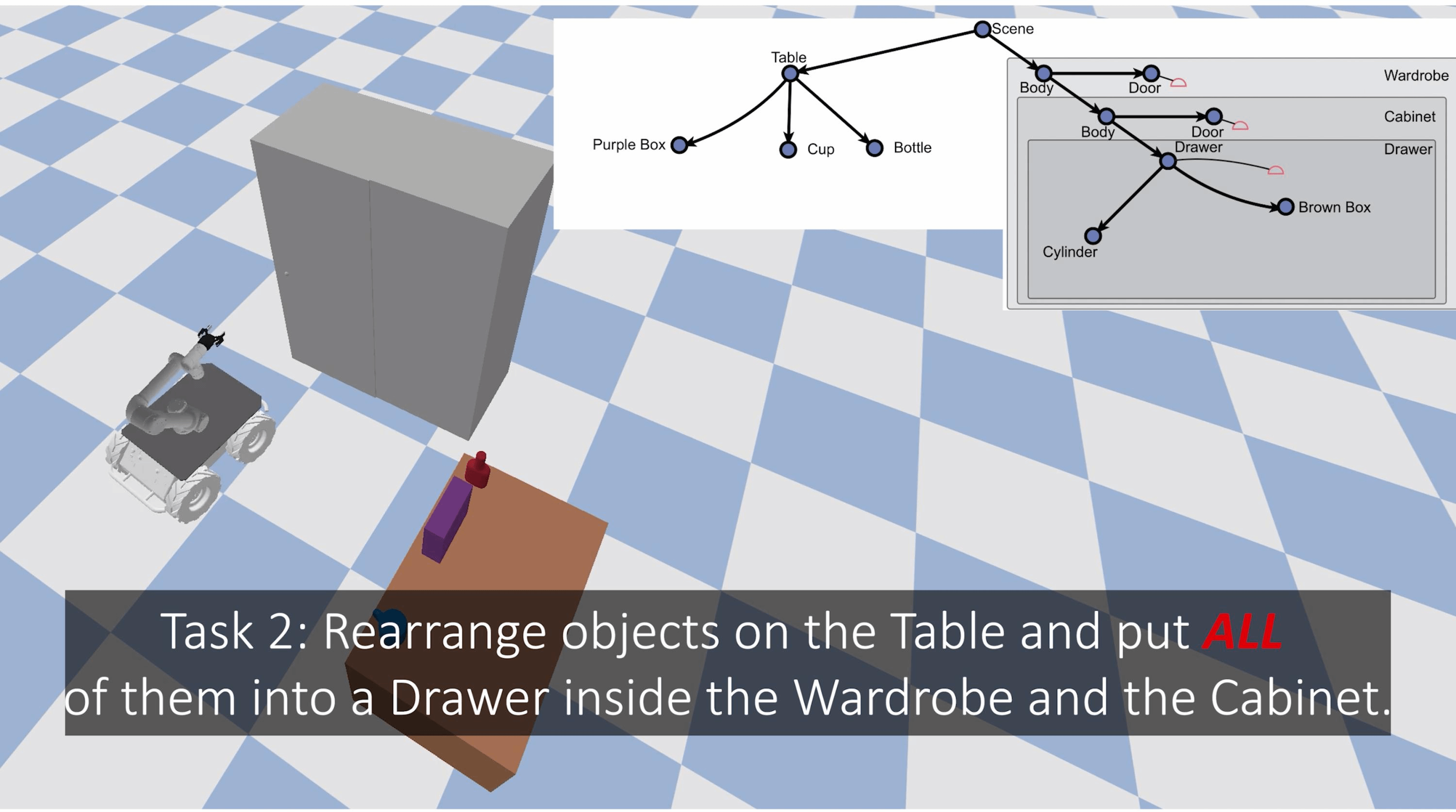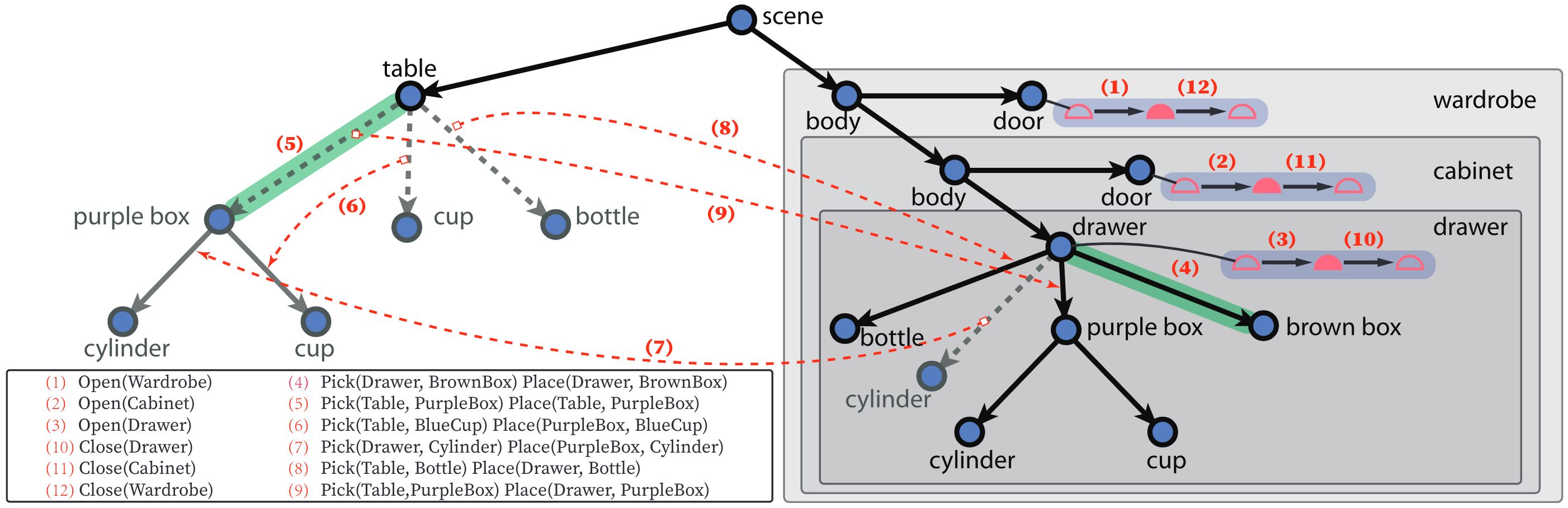 我们通过进一步完善[2]提出的场景图,在此之上提出了一套全新的任务规划方法[3]。首先来看下面这张图,机器人的任务是将桌子上的所有物体放到抽屉里,而抽屉是在两层橱柜里面(下左)。由于抽屉里原有的物体与有限的空间(下中),机器人需要小心安排物体摆放位置。在这里,我们使用了遗传算法(genetic algorithm)首先寻找可能的场景图结构(即物体间的逻辑关系),之后通过随机优化算法(stochastic optimization)确定物体位置(即利用空间几何信息避免与物理常识冲突),最终生成一个可行的目标场景图(下右)。