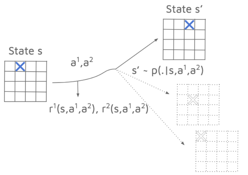 随机博弈(也称马尔科夫博弈)作为一种重要的博弈形式,是描述多智能体交互的核心数学模型,为研究多智能体学习、博弈与最优决策奠定了理论框架。具体来说,随机博弈是一种由多个参与者进行的具有状态转移概率的动态博弈过程,每个参与者独立地在每一轮博弈中决定自己的策略,根据当前状态与动作获得本轮奖励,下个阶段的状态根据状态转移概率以及所有玩家的动作发生转移,不断重复。在具体场景中,智能体(玩家)通常表现为合作、竞争或合作与竞争相交叠,分别对应于共有奖励函数、零和奖励函数与一般和奖励函数。
