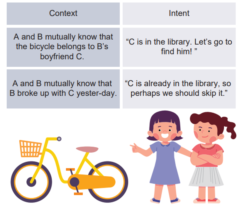 综述认为,人工社会智能(ASI) 相比于物理智能更具有挑战性,其中一个很大的挑战就是,它高度依赖于情境(context)。这里的情境可以是大到人群的文化背景和一般常识,也可以是小到两个人的共同经历。这里举一个例子:有两个朋友A和B在图书馆外面看到一辆自行车,其中一个女生A指向自行车,而另一个女生B对于这个指涉动作背后意图的理解取决于她们各自认知信念和共同信念的情境;如果两个人都知道这个自行车是B的男朋友C的,那么A的意图可能是说进图书馆去找C,而如果两个人都知道B和C刚刚分手了,那A的意图可能是说别去图书馆了。