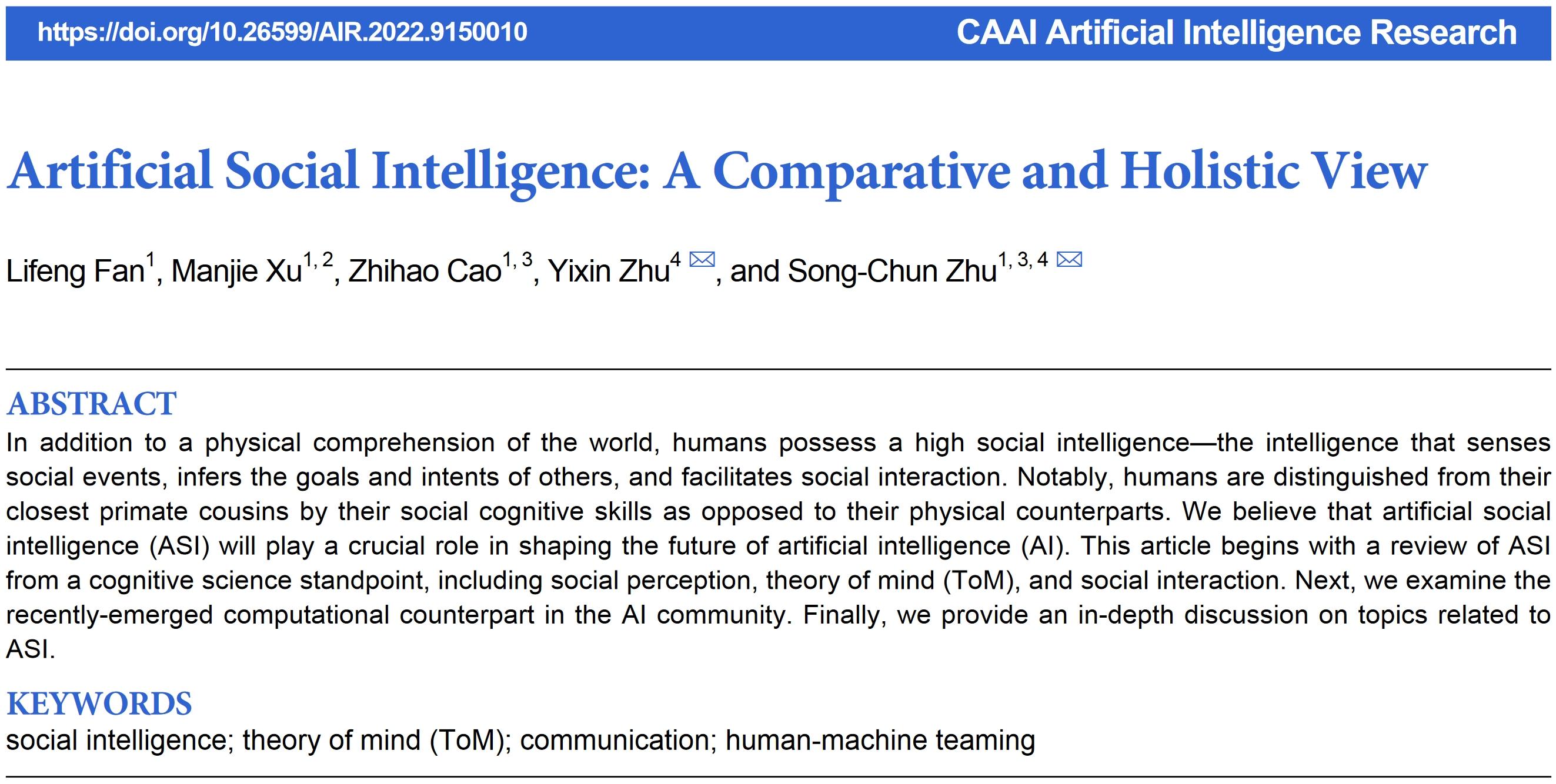 近日,北京大学人工智能研究院朱松纯教授、朱毅鑫助理教授联合北京通用人工智能研究院认知计算与常识推理实验室范丽凤等研究员,在CAAI Artificial Intelligence Research期刊上发表综述论文 Artificial Social Intelligence: A Comparative and Holistic View,呼吁对人工社会智能(Artificial Social Intelligence,简称ASI)领域的关注。