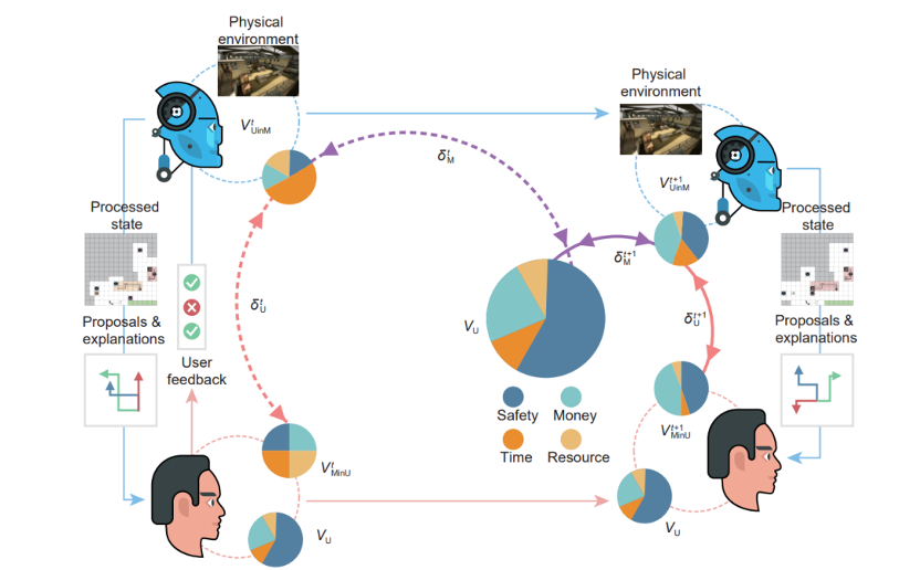 这项研究提出了一个基于即时双向价值对齐模型的可解释人工智能系统。在该系统中,一组机器人通过与人类的即时交互并通过人类的反馈来推断人类用户的价值目标,同时通过“解释”将其决策过程传达给用户,让用户了解机器人做出判断的价值依据。此外,该系统通过推测用户的内在价值偏好,并预测最佳的解释方式,生成人类更容易理解的解释。结果表明,该学习模型基于心智理论,可以在复杂协作任务中提高人机协作的效率,进而提升人机信赖关系,实现真正的自主智能。