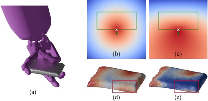 其中(b)、(d)表⽰欧⽒距离以及在欧式距离下(a)图所⽰抓握对应的接触⾯;(c)、(e)表⽰对⻬距离以及在对⻬距离下(a)图所⽰抓握对应的接触⾯。