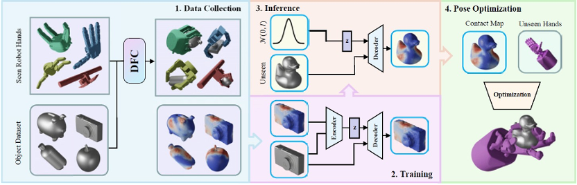 接下来,通过优化⼿的姿势以匹配⽣成出来的接触⾯。最后,通过物理模拟进⼀步优化抓握姿态,以确保接触在物理上是可⾏的。GenDexGrasp通过减少对⼿结构的假设来提供泛化性,并通过改进接触⾯的计算⽅式和⾼效的优化⽅案实现快速推理,通过随机初始化的变分⽣成模型实现多样化的抓握⽣成。