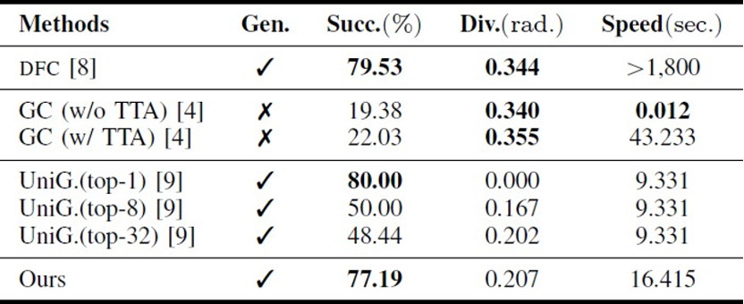表1:定量实验结果,表明我们的⽅法⾸次同时在成功率、多样性和推理速度三个⽅⾯实现均衡。