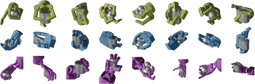 图4:GenDexGrasp在三指机械⼿(Barrett,第⼀⾏)、四指机械⼿(Allegro,第⼆⾏)和五指机械⼿(Shadowhand,第三⾏)的⽣成结果。