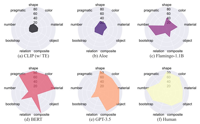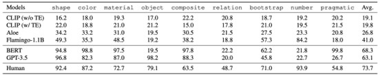 数据显示,最好的视觉-语言模型是Flamingo-1.1B(41.0%),只有人类(73.2%)能力的大约一半。与此同时,带有CLIP特征的普通Transformer模型在所有任务上的表现只能达到随机水平(不到20%)。Aloe的以物体为中心(object-centric)的表示有助于提高性能至26.8%,但由于模型容量有限和缺乏预训练,可能会表现得更差。深入观察和分析研究结果可以发现,视觉-语言预训练模型在基本属性命名任务(即形状、颜色、材料)上表现相对良好,但无法推广到对象关系和利用语用线索进行推理。一个有趣的观察是,Flamingo模型可以解决一小部分自举任务和一些数字任务。这个结果可能归因于Flamingo模型基于语言模型,捕获句法线索并理解熟悉的词以自举单词学习。