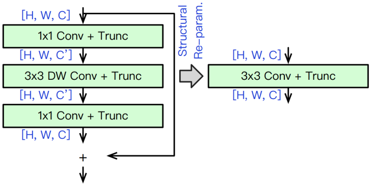 对于CoPriv,去除“不重要的”ReLU后,翻转残差块就变成了线性结构,从而可以通过网络重参数化,进一步将Point-wise卷积和Depth-wise卷积融合成单个卷积层,重参数化过程如下图所示: