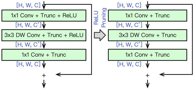 为了保证整个翻转残差块可以进一步融合,我们在剪枝过程中让两个ReLU共享同一个架构参数,剪枝ReLU过程如下图所示: