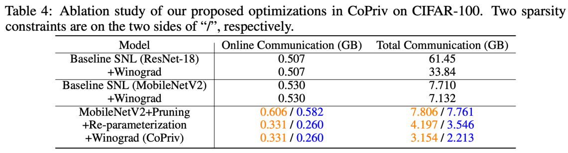 此外,我们对CoPriv的不同优化技术进行了消融实验,下图中的结果表明我们提出的ReLU剪枝、网络重参数化、Winograd卷积协议都对隐私推理效率有所帮助。