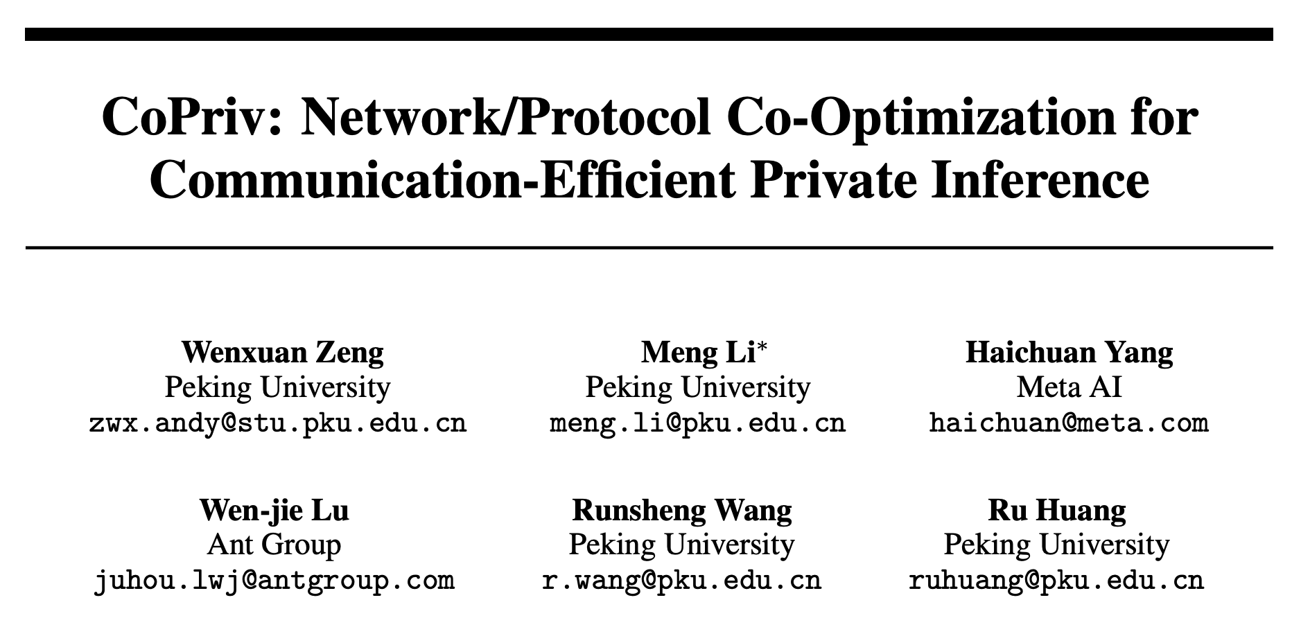 北京大学人工智能研究院李萌课题组通过协同优化神经网络架构和隐私推理协议,将隐私推理的通信开销降低近4倍,该工作论文“CoPriv: Network/Protocol Co-Optimization for Communication-Efficient Private Inference”目前发表于NeurIPS 2023。