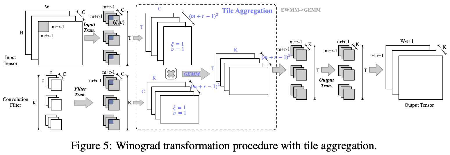 我们发现,虽然Winograd变换帮助降低了乘法次数,但是原本的逐元素乘法(EWMM)无法利用隐私计算中基于不经意传输协议的矩阵乘法批优化(Batch Optimizatin),带来了昂贵的开销。因此,我们提出块聚集技术将EWMM转化为通用矩阵乘法(GEMM)的形式,以降低通信开销。卷积协议和计算流程如下图所示: