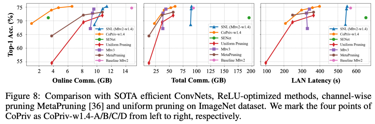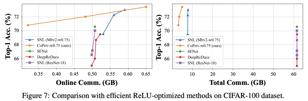 如下图所示,我们在CIFAR-100和ImageNet两个数据集上进行了实验,结果表明CoPriv在准确率和在线/总通信量方面均优于基准方法,并且现有的ReLU优化工作,如DeepReDuce、SNL、SENet,无法有效降低总体通信开销。